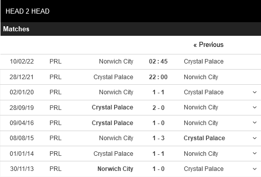Thống kê đối đầu Crystal Palace vs Norwich