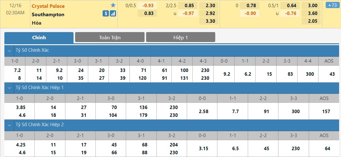 Tỷ lệ kèo cá cược bóng đá trận Crystal Palace vs Southampton