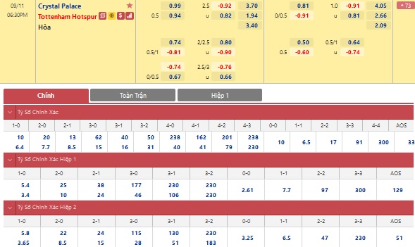 Xem tỉ lệ kèo cá cược bóng đá trực tuyến Crystal Palace vs Tottenham