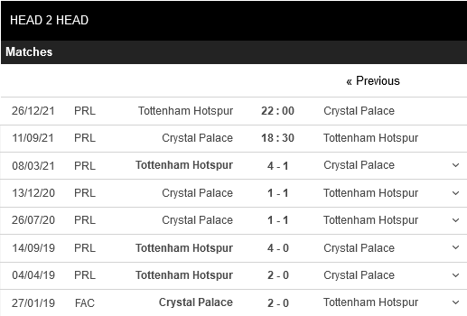 Thành tích đối đầu của Palace với Tottenham không tốt khi họ chỉ thắng 1 trong 10 lần đụng độ gần nhất, thua tới 7 trận. Phong độ của Palace gần đây cũng không tốt khi thua kèo 3/4 trận gần nhất.