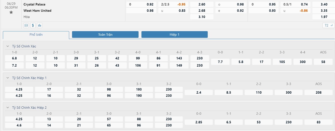 Xem tỷ lệ kèo cá cược bóng đá trực tuyến Crystal Palace vs West Ham
