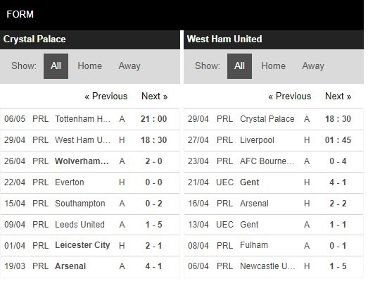 Thống kê phong độ Crystal Palace vs West Ham