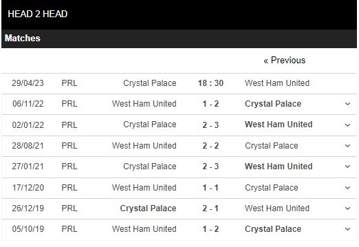 Thống kê đối đầu Crystal Palace vs West Ham