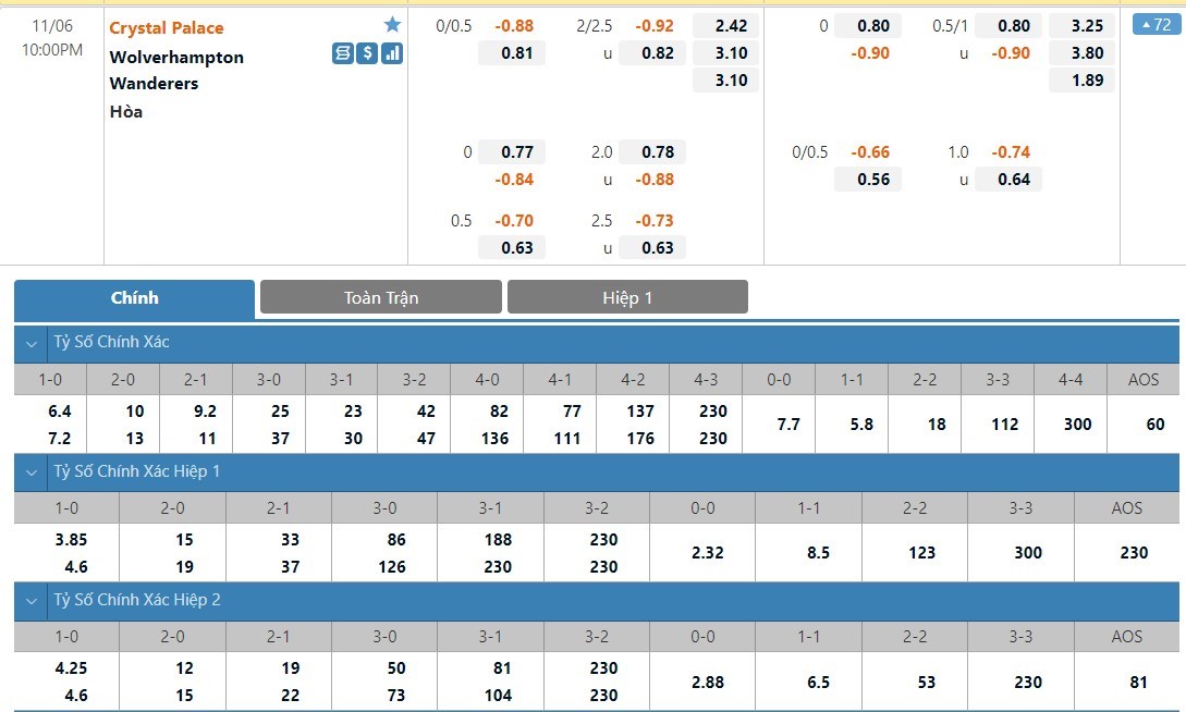 Tỷ lệ kèo cá cược bóng đá trận Crystal Palace vs Wolverhampton