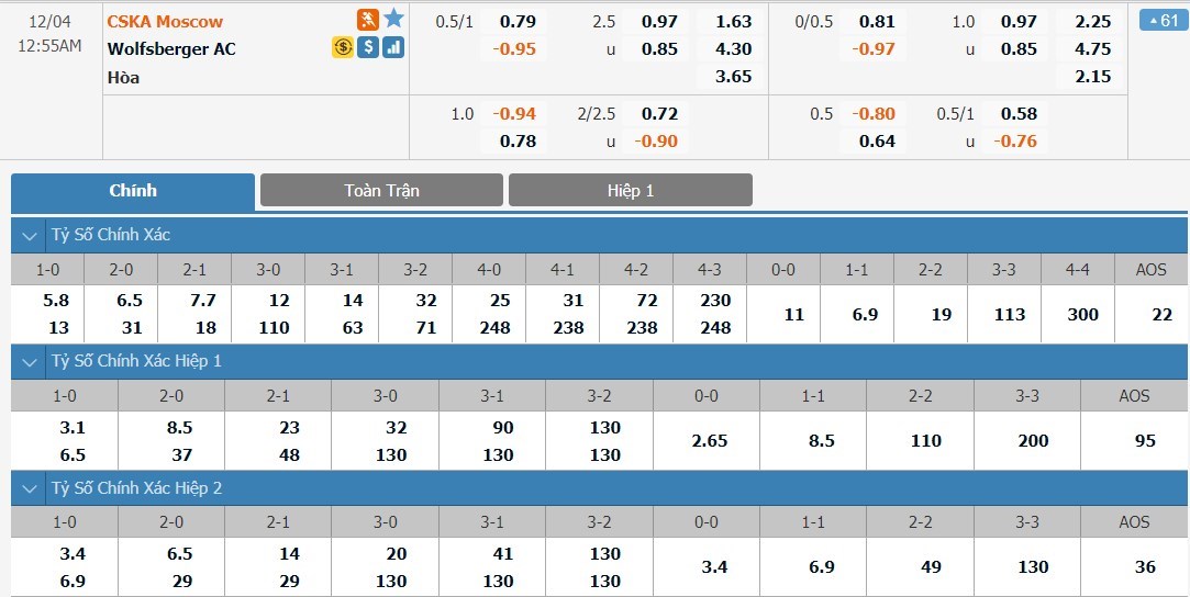 Tỷ lệ kèo cá cược bóng đá trực tuyến trận CSKA Moscow vs Wolfsberger AC