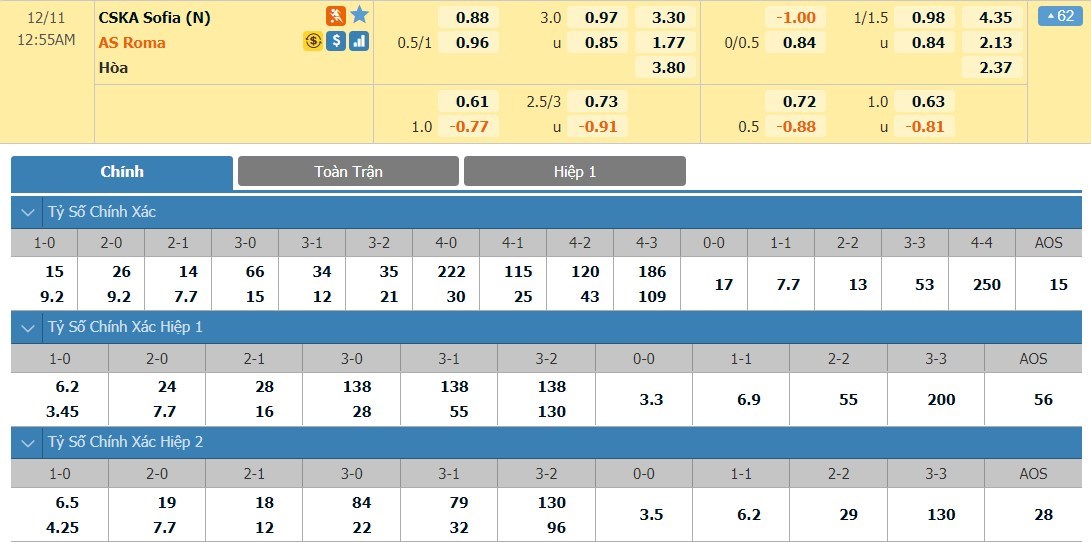 Xem tỷ lệ kèo cá cược bóng đá trực tuyến CSKA Sofia vs AS Roma