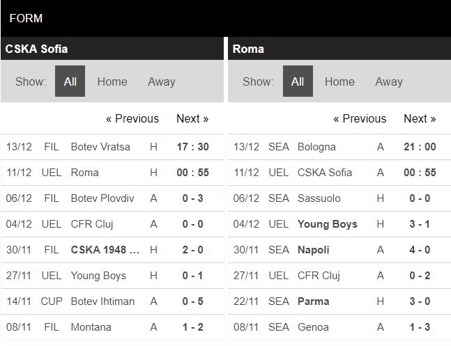 Bảng A của UEFA Europa League năm nay sẽ khép lại với cuộc đụng độ giữa CSKA Sofia và đối thủ AS Roma. CSKA Sofia bị đánh giá thấp nhất trước khi bảng A khởi tranh và thực tế đã cho thấy rõ điều này. Cầm hoà CFR Cluj ở lượt trận trước, đại hiện Hungary vẫn không thể có thắng lợi nào sau 5 lượt trận đầu. 2 điểm có được, họ sẽ chắc chắn là cái tên đứng cuối cùng mặc cho kết quả lượt trận cuối ra sao. Chính vì lẽ đó mà người ta không mấy hy vọng vào một kết quả tích cực dành cho đội bóng này.