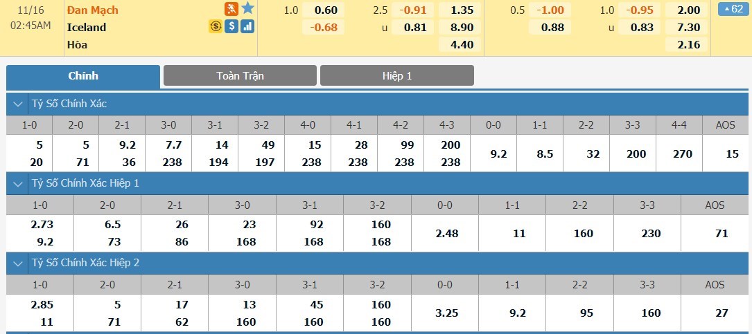 Tỷ lệ kèo cá cược bóng đá trực tuyến trận Đan Mạch vs Iceland