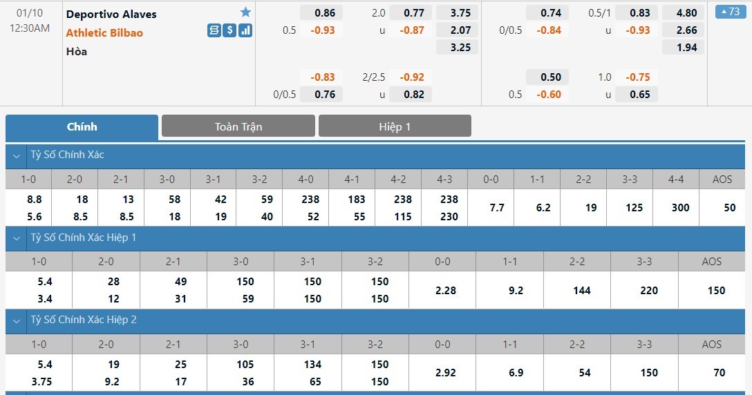 Tỷ lệ kèo cá cược bóng đá trực tuyến trận Deportivo Alaves vs Athletic Bilbao
