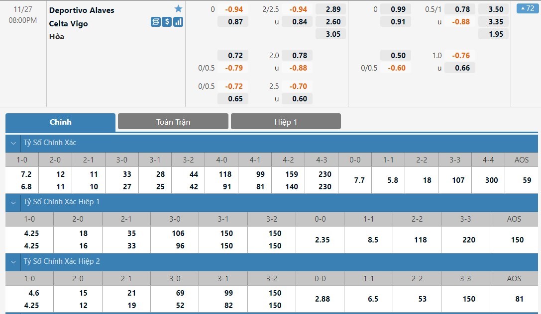 Tỷ lệ kèo cá cược bóng đá trận Deportivo Alaves vs Celta Vigo