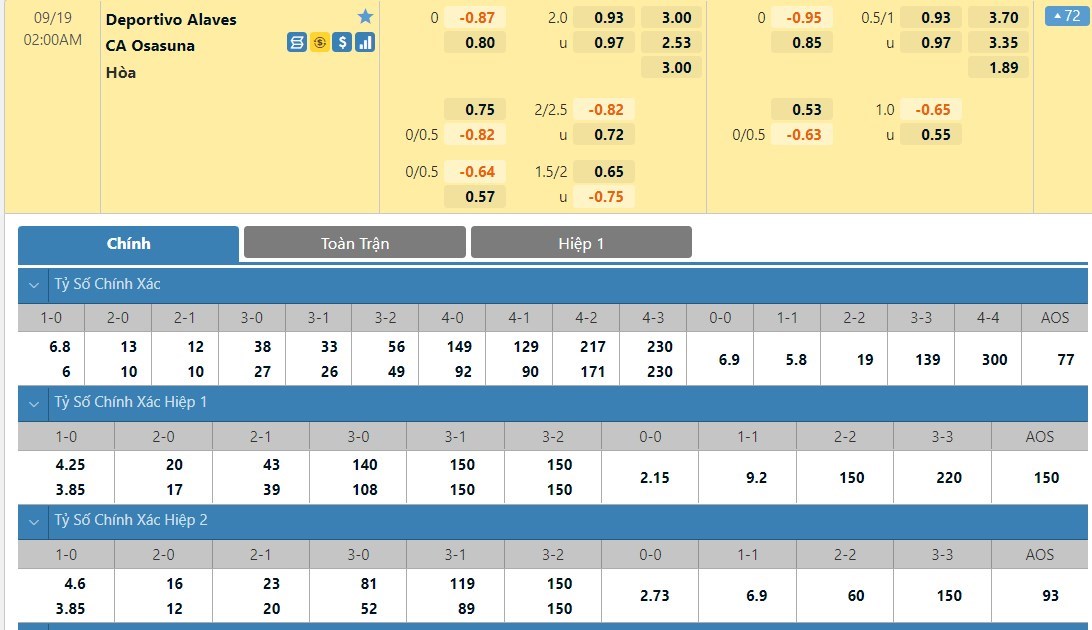 Tỷ lệ kèo cá cược bóng đá trận Deportivo Alaves vs Osasuna