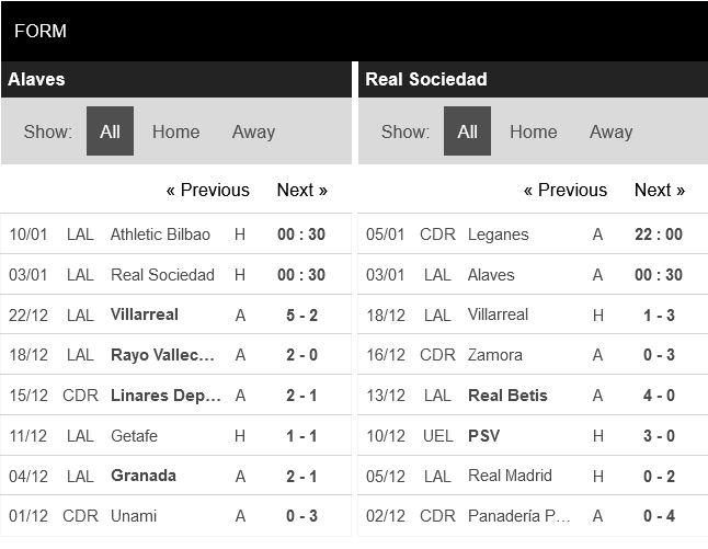 Thống kê phong độ Deportivo Alaves vs Real Sociedad