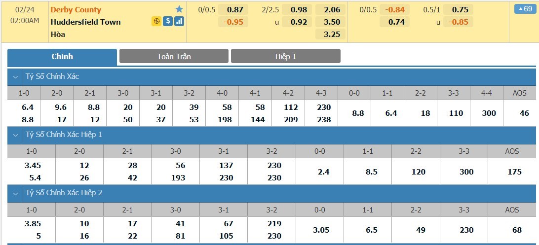 Tỷ lệ kèo cá cược bóng đá trận Derby County vs Huddersfield