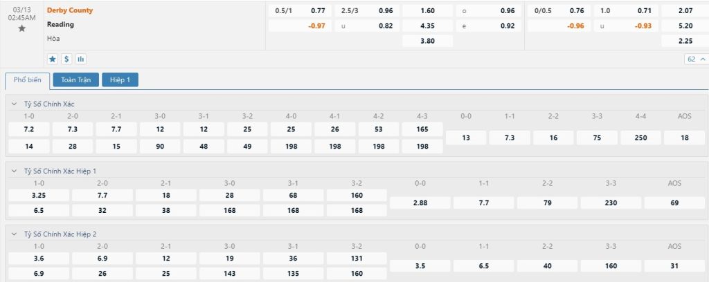 Tỷ lệ kèo cá cược bóng đá trực tuyến trận Derby vs Reading