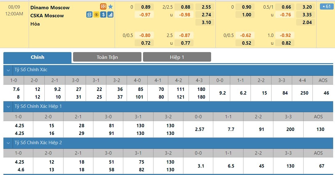 Tỷ lệ kèo cá cược bóng đá trận Dinamo Moscow vs CSKA Moscow