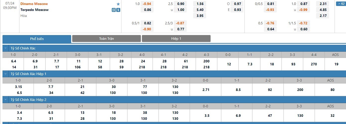 Tỷ lệ kèo cá cược bóng đá trận Dinamo Moscow vs Torpedo Moscow