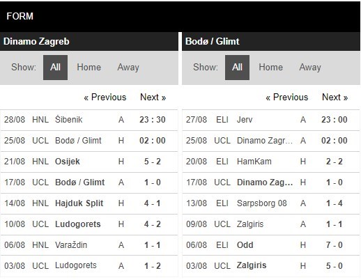 Thống kê phong độ Dinamo Zagreb vs Bodo Glimt