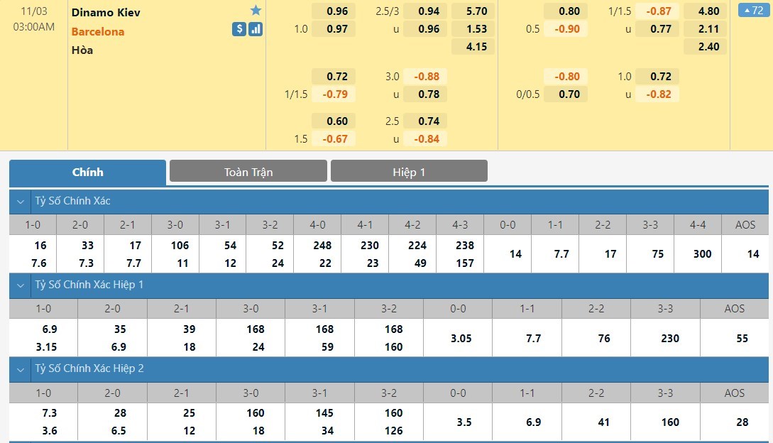 Tỷ lệ kèo cá cược bóng đá trực tuyến trận Dynamo Kyiv vs Barcelona