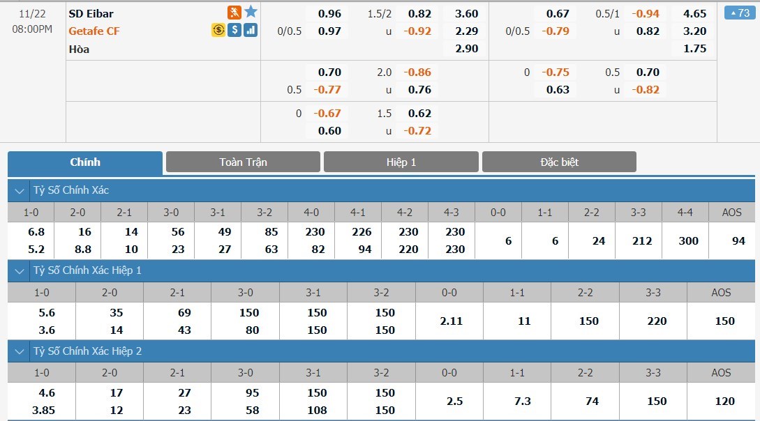 Tỷ lệ kèo cá cược bóng đá trận Eibar vs Getafe