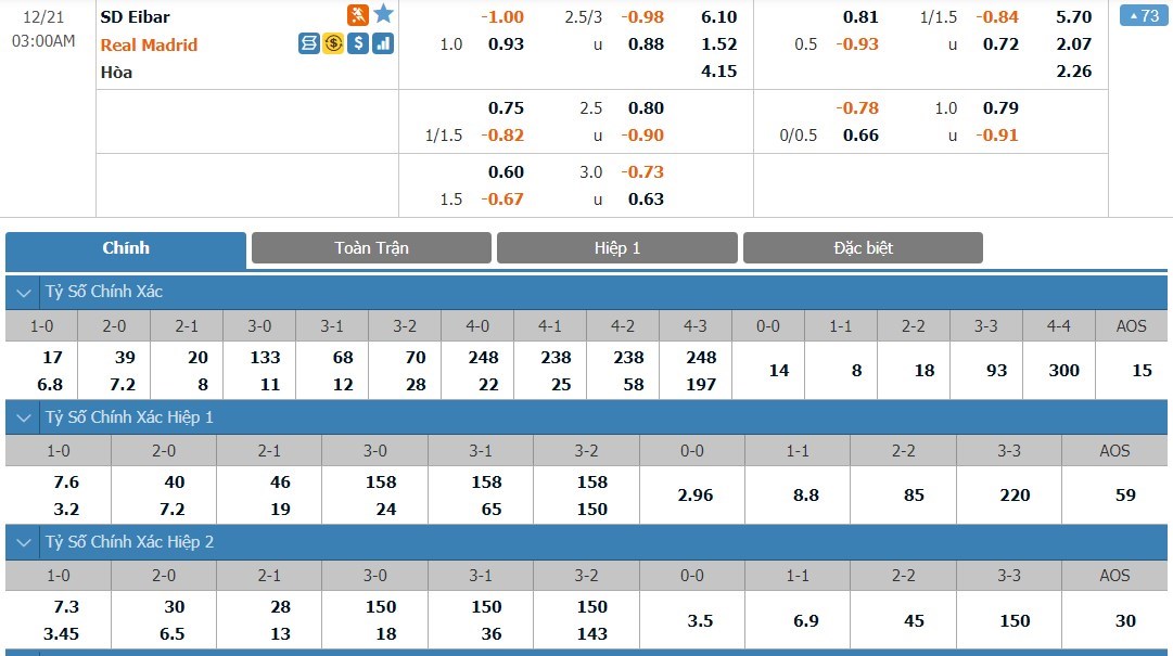Tỷ lệ kèo cá cược bóng đá trực tuyến trận Eibar vs Real Madrid