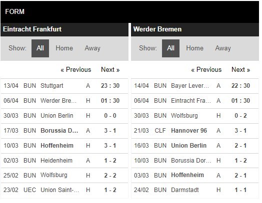Thống kê phong độ Eintracht Frankfurt vs Werder Bremen
