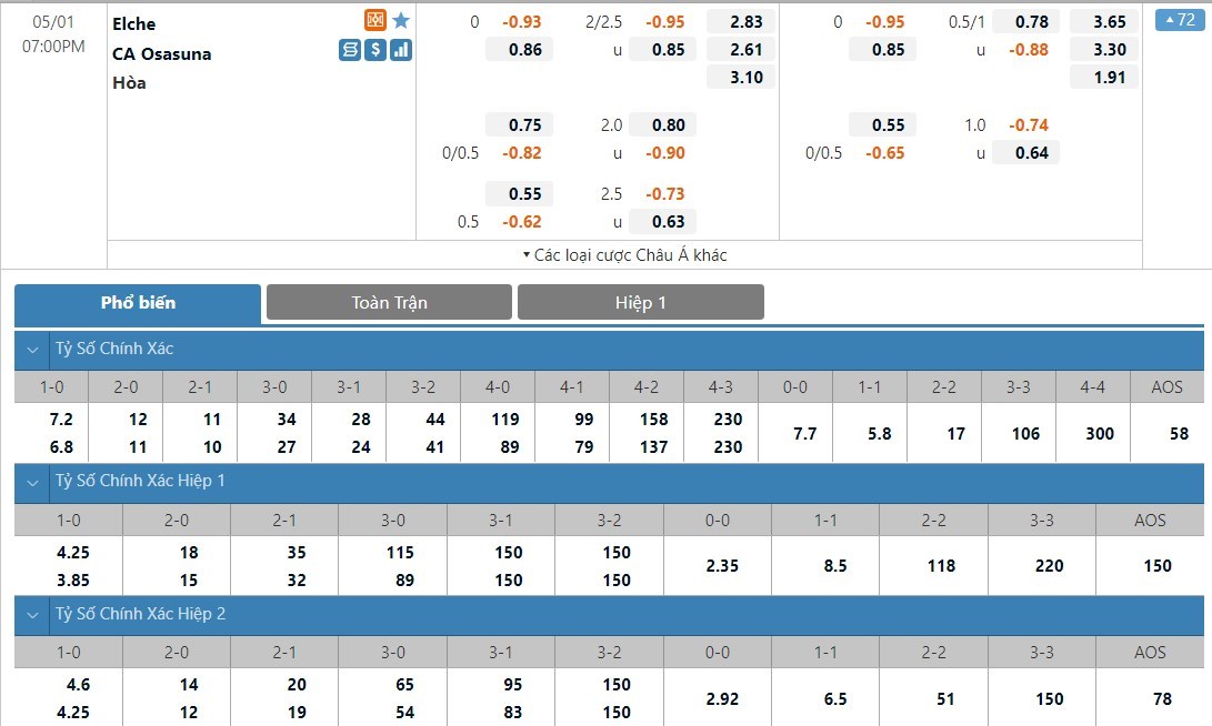 Tỷ lệ kèo cá cược bóng đá trực tuyến trận Elche vs Osasuna