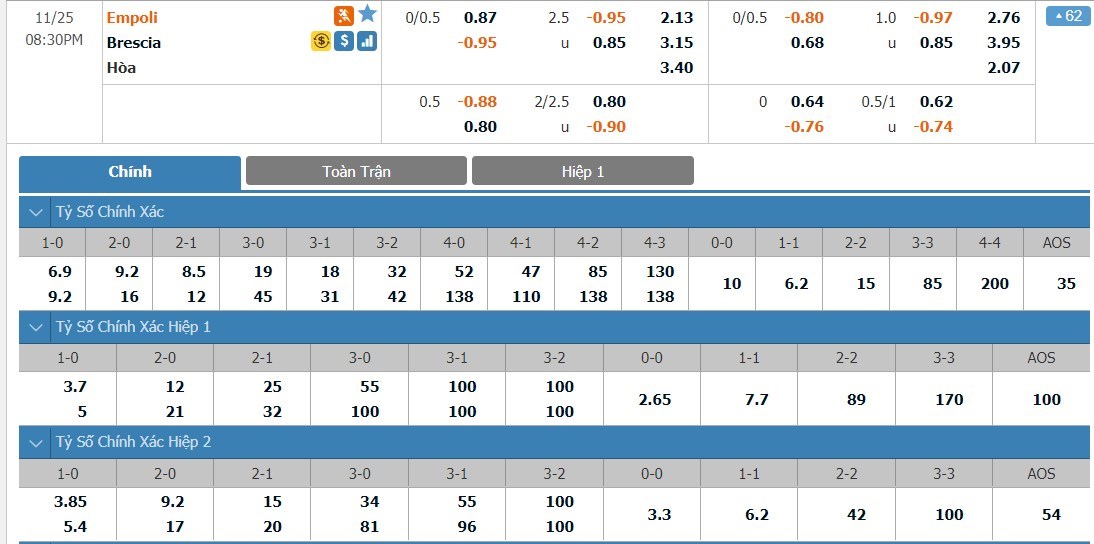 Tỷ lệ kèo cá cược bóng đá trận Empoli vs Brescia