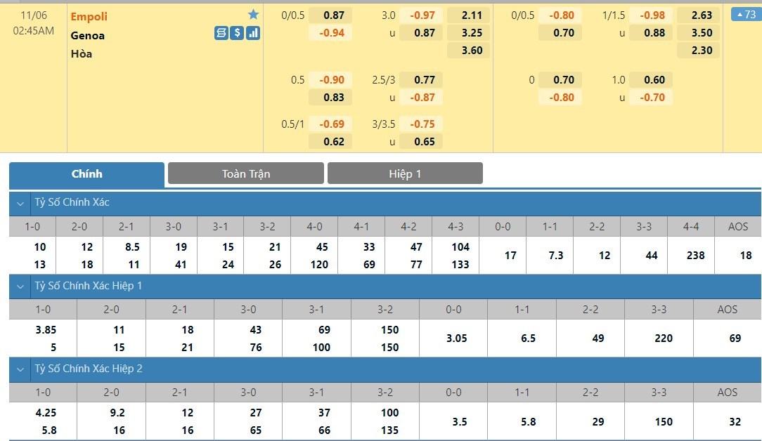 Tỷ lệ kèo cá cược bóng đá trận Empoli vs Genoa