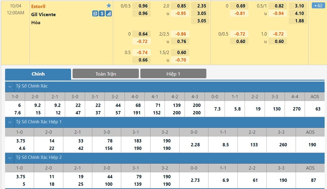 Tỷ lệ kèo cá cược bóng đá trực tuyến trận Estoril vs Gil Vicente