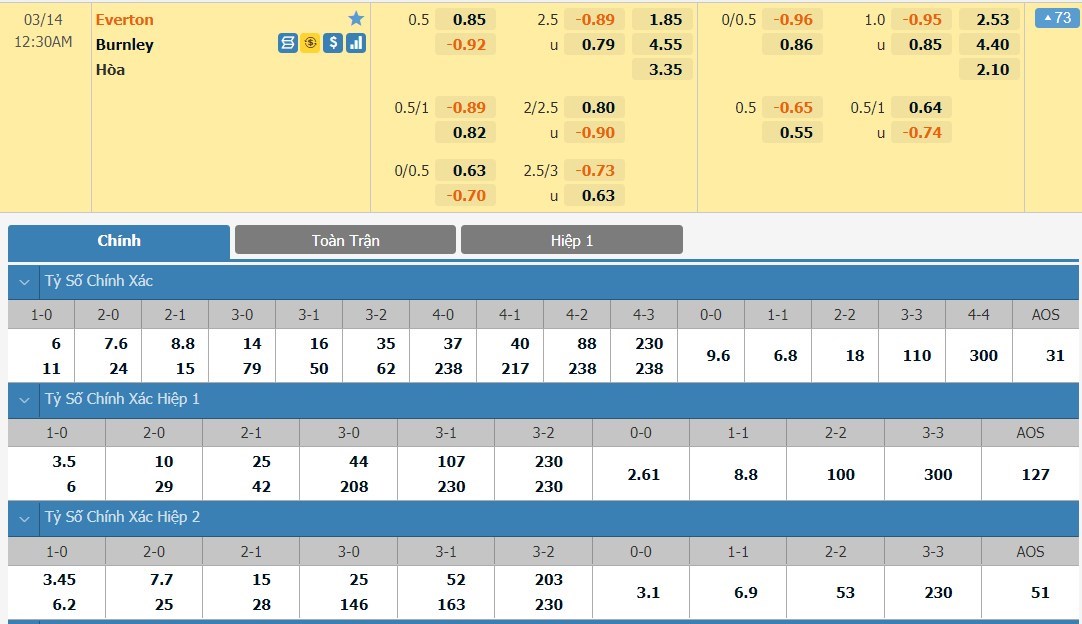 Xem tỷ lệ kèo cá cược bóng đá trực tuyến Everton vs Burnley