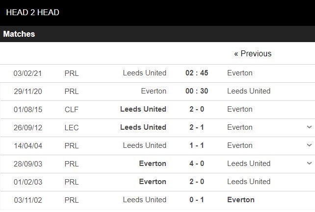 Thống kê đối đầu Everton vs Leeds United