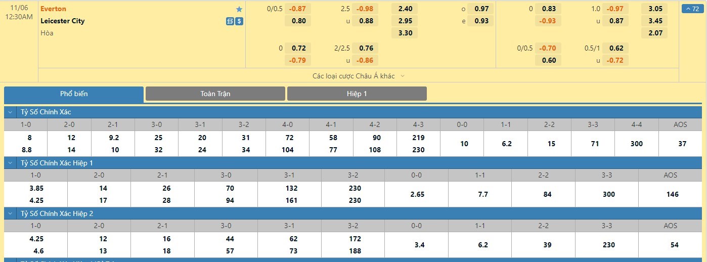 Tỷ lệ kèo cá cược bóng đá trận Everton vs Leicester