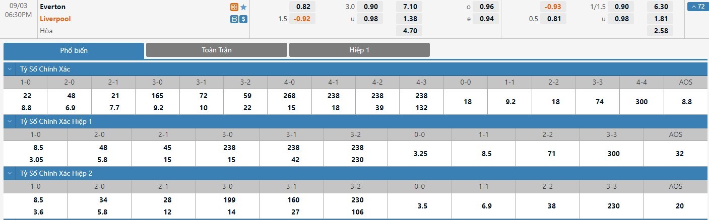 Xem tỷ lệ kèo cá cược bóng đá trực tuyến Everton vs Liverpool
