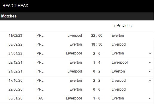 Thống kê đối đầu Everton vs Liverpool