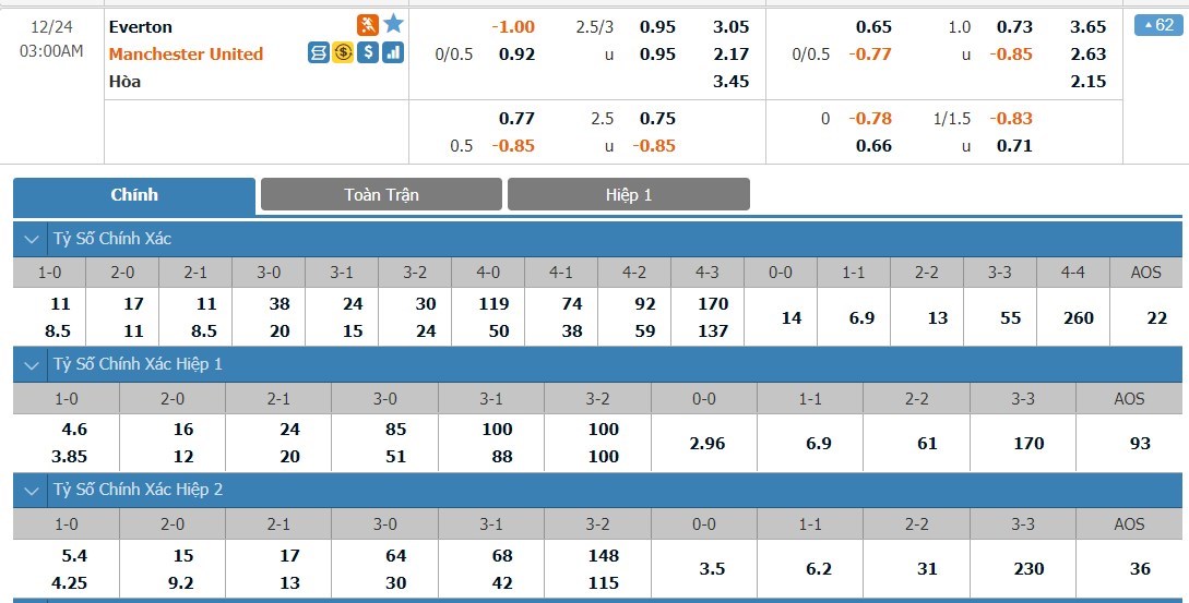 Xem tỷ lệ kèo cá cược bóng đá trực tuyến Everton vs Manchester United