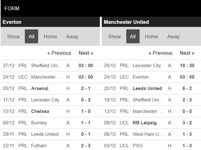 Hồi đầu tháng 11 năm nay, Everton đã để thua 1-3 trên chính sân nhà Goodison Park của mình khi đón tiếp Manchester United. Đây là bài học kinh nghiệm đắt giá dành cho Everton và họ chắc chắn sẽ thi đấu tập trung hơn trong màn tái đấu này. Phong độ của Everton là không tồi khi họ đang có mạch 3 chiến thắng liên tiếp. Đây được dự báo sẽ là một trận đấu vô cùng khó khăn cho Quỷ đỏ.
