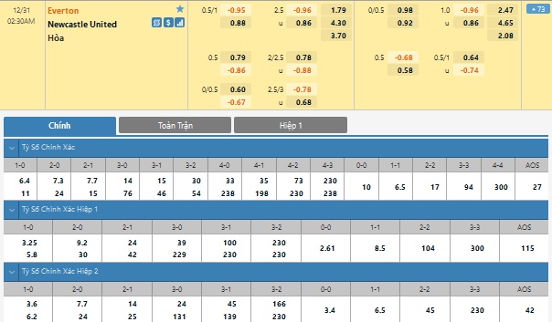 Xem tỉ lệ kèo cá cược bóng đá trực tuyến Everton vs Newcastle United