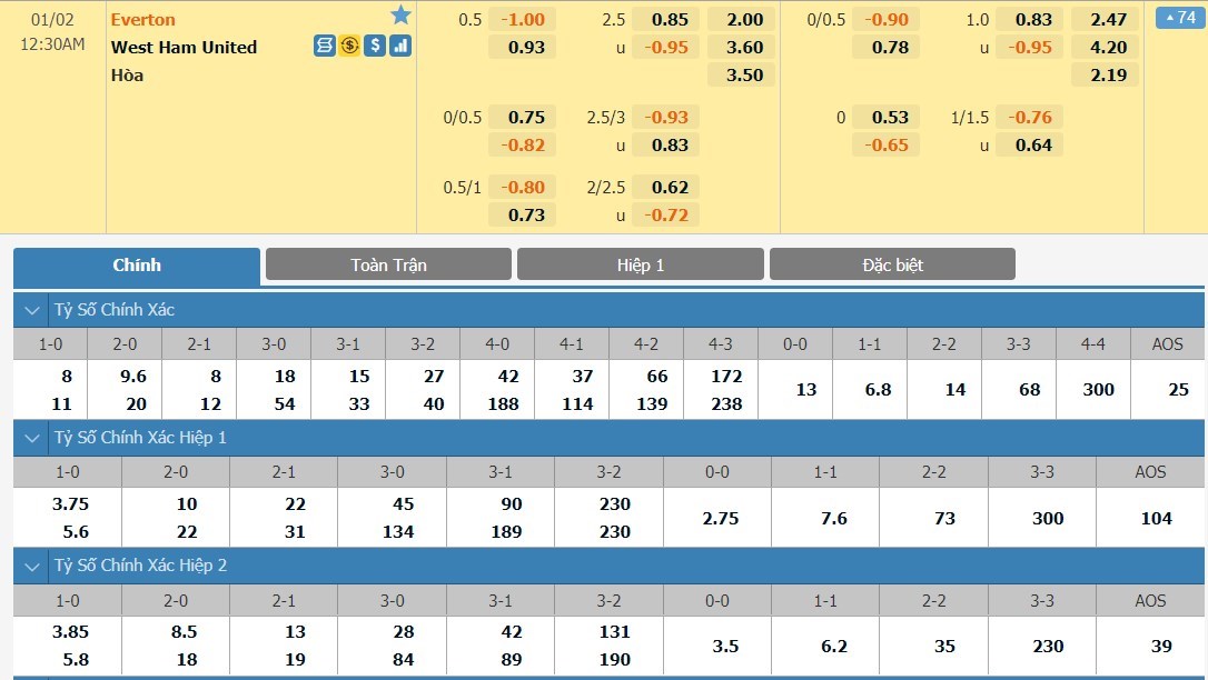 Tỷ lệ kèo cá cược bóng đá trực tuyến trận Everton vs West Ham