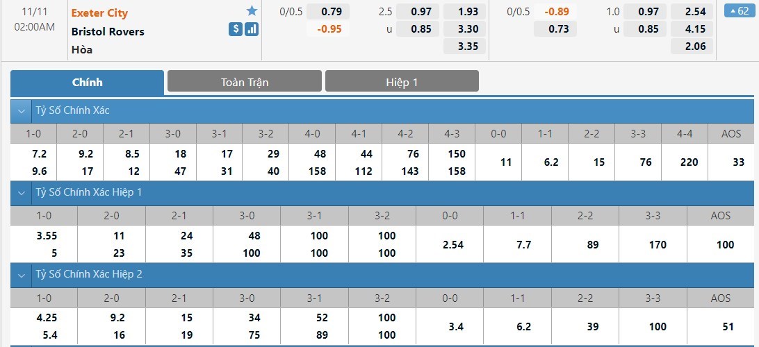 Tỷ lệ kèo cá cược bóng đá trận Exeter vs Bristol Rovers