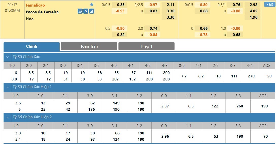Tỷ lệ kèo cá cược bóng đá trận Famalicao vs Pacos de Ferreira