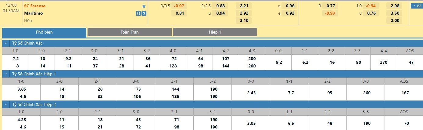 Tỷ lệ kèo cá cược bóng đá trận Farense vs Maritimo