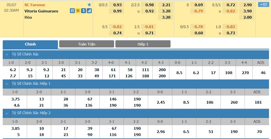 Tỷ lệ kèo cá cược bóng đá trực tuyến trận Farense vs Vitoria de Guimaraes