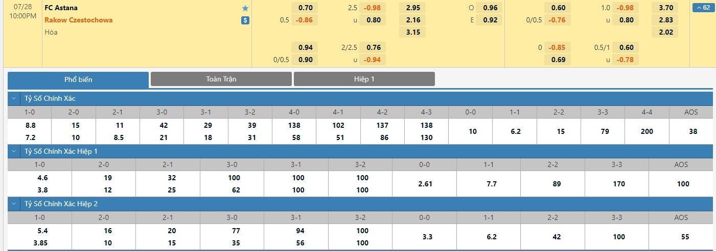 Tỷ lệ kèo cá cược bóng đá trận FC Astana vs Rakow Czestochowa
