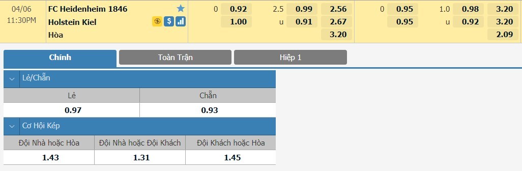 Tỷ lệ kèo cá cược bóng đá trận FC Heidenheim vs Holstein Kiel
