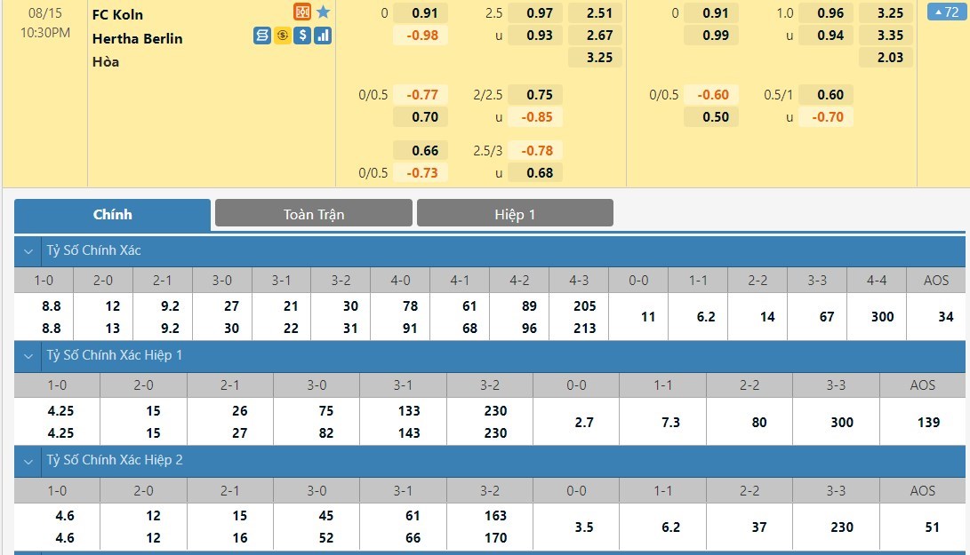 Tỷ lệ kèo cá cược bóng đá trận FC Koln vs Hertha Berlin