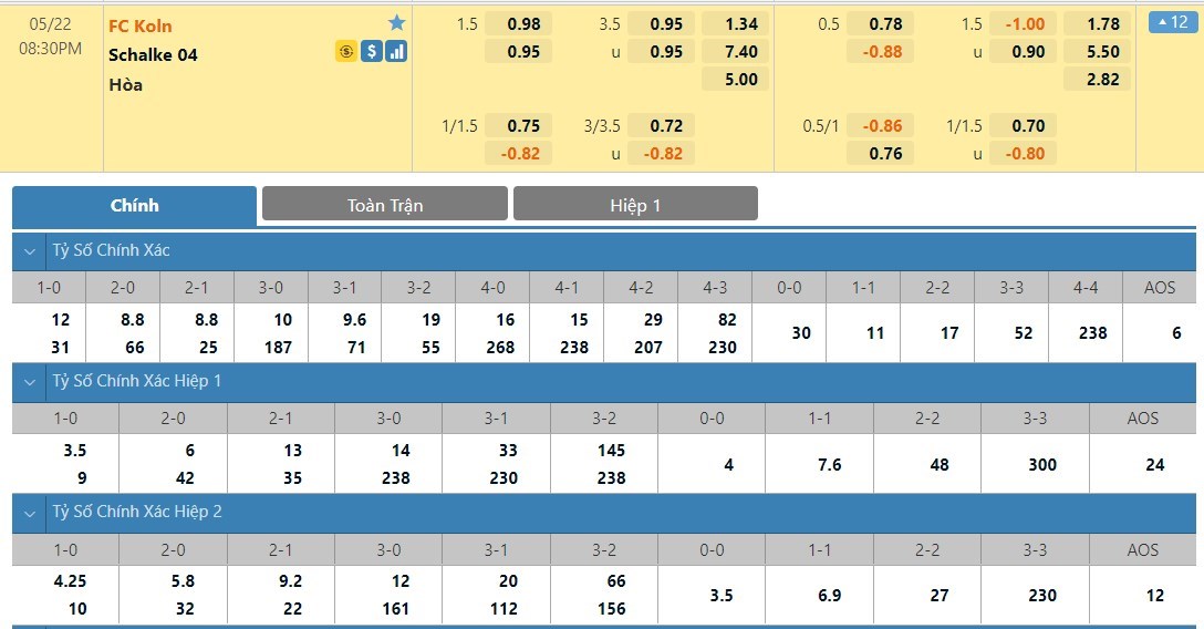 Tỷ lệ kèo cá cược bóng đá trận FC Koln vs Schalke 04