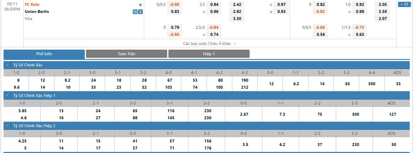 Tỷ lệ kèo cá cược bóng đá trận FC Koln vs Union Berlin
