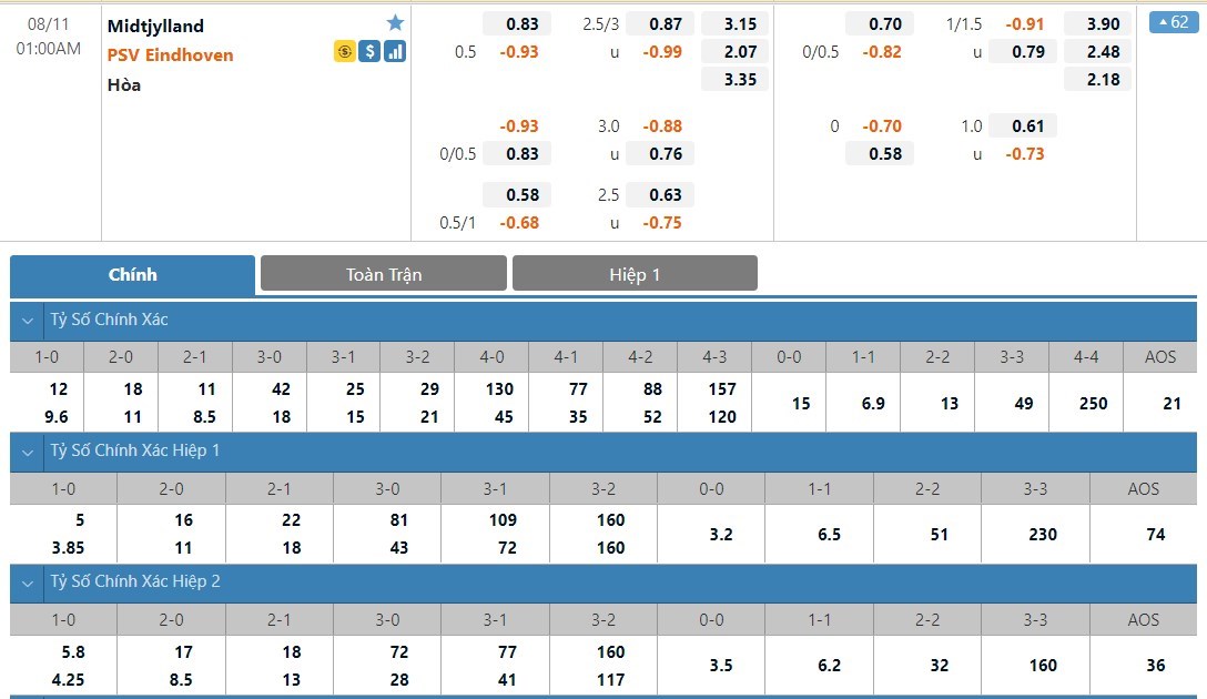 Tỷ lệ kèo cá cược bóng đá trực tuyến trận FC Midtjylland vs PSV Eindhoven