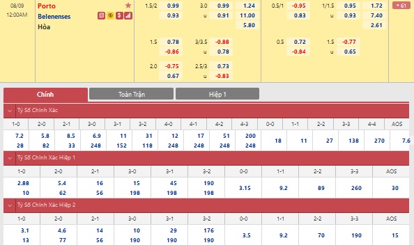 Xem tỉ lệ kèo cá cược bóng đá trực tuyến FC Porto vs Belenenses