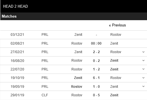 Thống kê đối đầu FC Rostov vs Zenit St. Petersburg